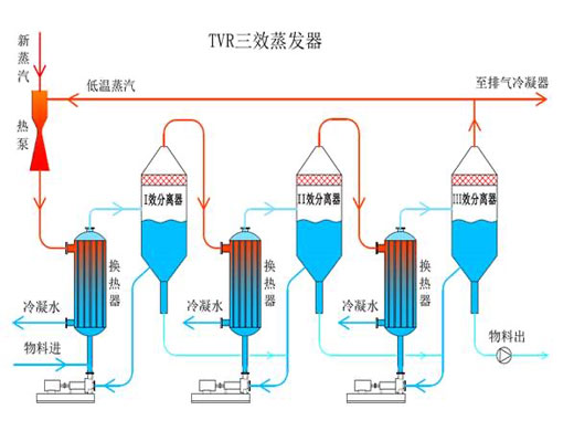 三效蒸發(fā)器是MVR蒸發(fā)器的一種,主要由三個蒸發(fā)器組合而成,三效蒸發(fā)器在運行時,需要后效的壓強和溶液的沸點均低于前效蒸發(fā)器,引入前效的二次蒸汽作為后效的加熱介質(zhì),即后效的加熱室成為前效二次蒸汽的冷凝器,一般一效需要消耗生蒸汽。